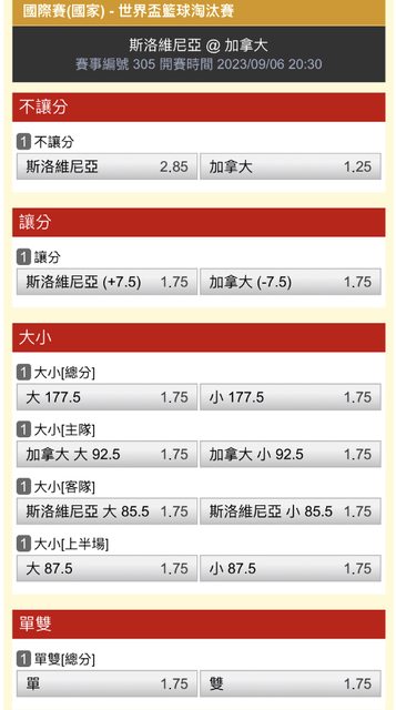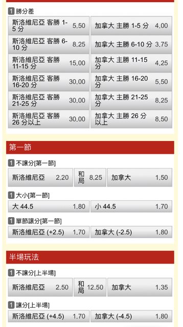 : 一 二 三 四 T : 斯洛維尼亞 24 26 21 : 加拿大 26 24 30 : Q1開44.5->50 : Q2開44.5->50 : Q3開45.5->51 : Q4 https://i.imgur.com/HhlNBnC.jpg