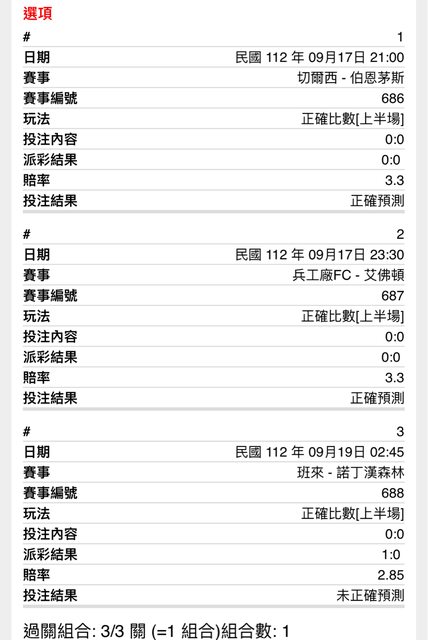上面這兩張三串1是我當天看到K1連開2場小球之後,立刻在晚上英超開賽賽前買的 因為我原本是看好破車開大球 可是連兩場蛋蛋場,我就覺得很有可能晚上英超跟著小,就買了這兩張3串1 結果沒想到倒最有把握的森林場 如果森林不是隔天踢的話,這兩張應該都會過 因為當時我下注的時候以為森林場是跟槍槍破車同一天踢的 所以有時候下串關注的時候要看清楚時間 不然球的運勢會跑掉 以上是個人見解 給大家參考看看 -- ※ 發信站: 批踢踢實業坊(www.ptt-web.org.tw), 來自: 180.176.215.226 (臺灣) ※ 文章網址: https://www.ptt-web.org.tw/SportLottery/M.1695089891.A.116