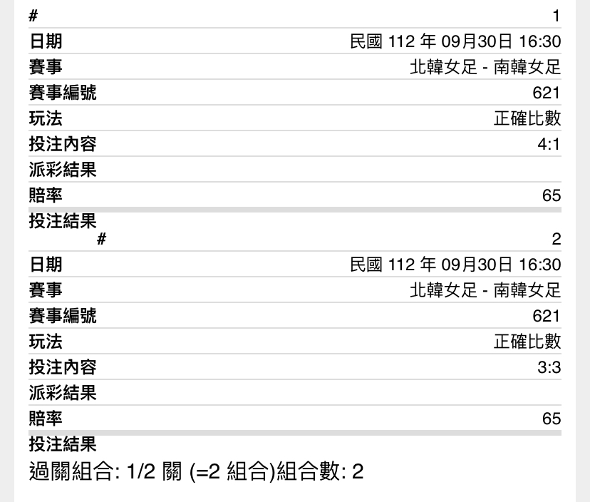 北韓女足 4 南韓女足 1 紅牌*1 HT:1:1 FT: 4:1 ----- Sent from JPTT on my HTC U12 life. -- ※ 發信站: 批踢踢實業坊(www.ptt-web.org.tw), 來自: 101.137.195.131 (臺灣) ※ 文章網址: https://www.ptt-web.org.tw/SportLottery/M.1696060807.A.716
