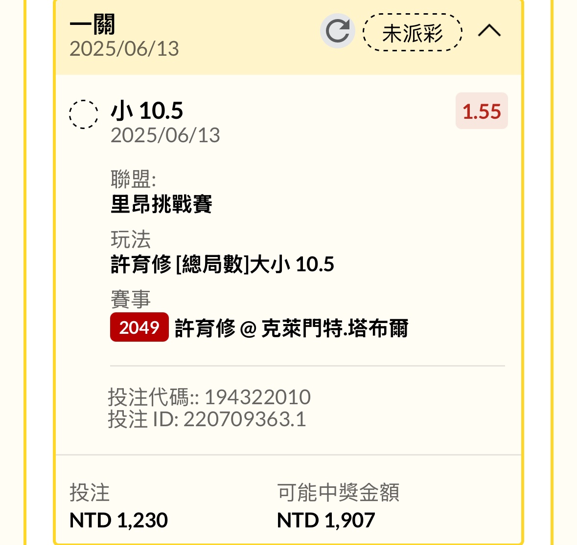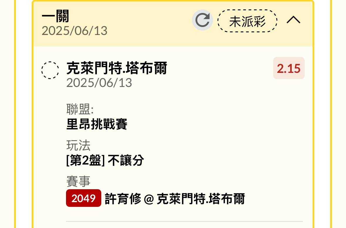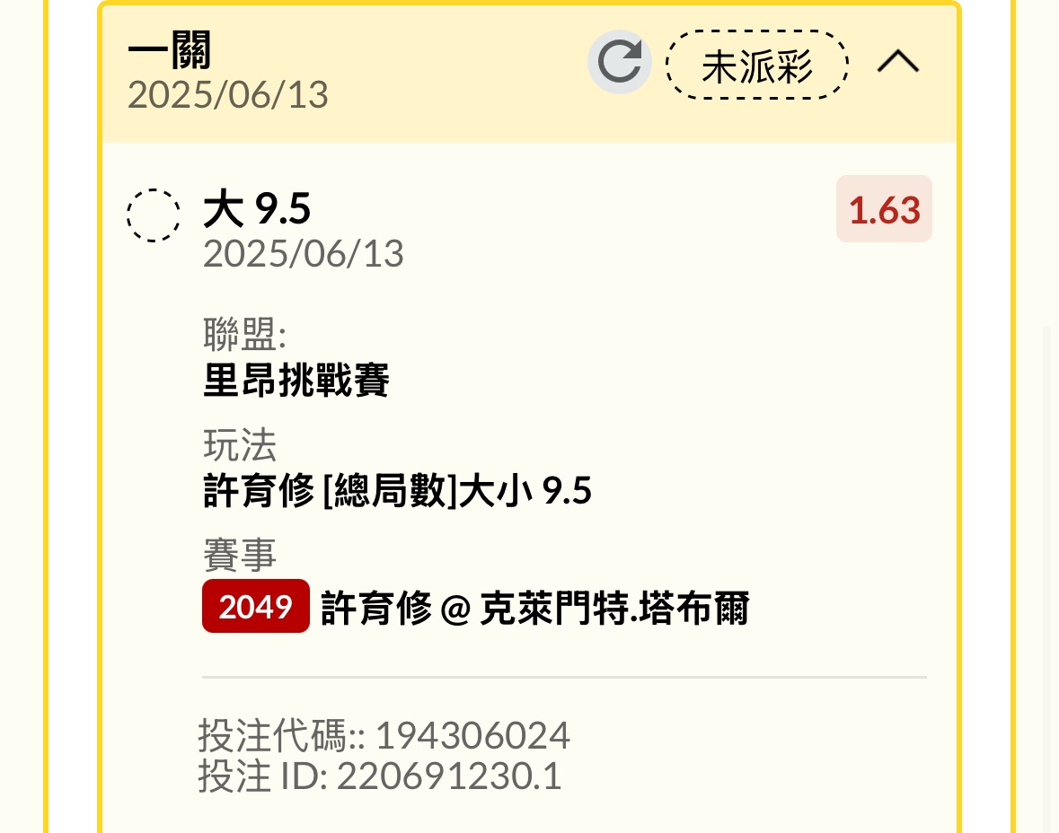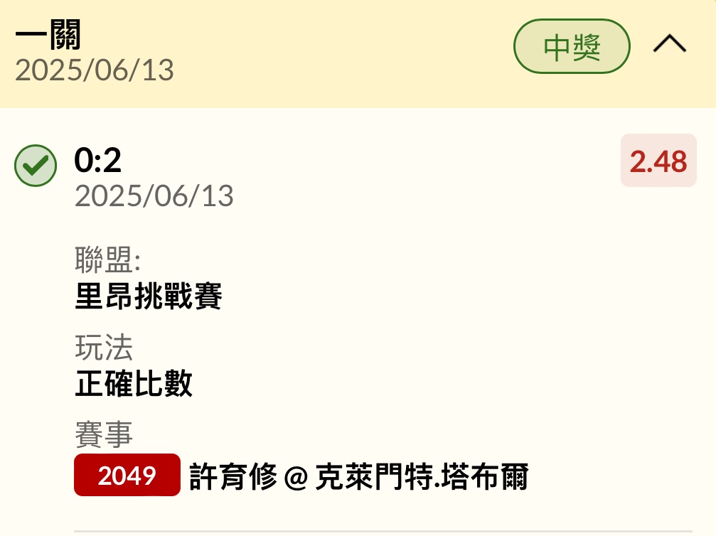 一 二 T 許育修 4 6 0 克萊門特.塔布爾 6 7 2 ATP里昂 紅土 -- ※ 發信站: 批踢踢實業坊(www.ptt-web.org.tw), 來自: 125.230.32.61 (臺灣) ※ 文章網址: https://www.ptt-web.org.tw/SportLottery/M.1749806079.A.90F