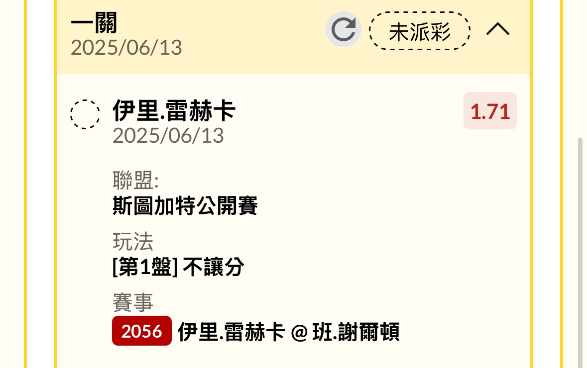 hanhan1104: 賽前兩邊pk都1.72 場中直接1.6642.72.92.150 06/13 23:05