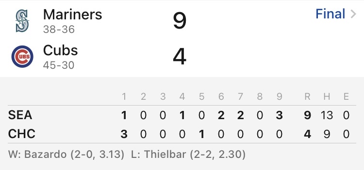 2025 Major League Baseball regular season Wrigley Field, Chicago, Illinois https://i.imgur.com/43XQMLs.jpeg Seattle Mariners 37-36 Chicago Cubs 45-29 西雅圖水手 勝 2.00 西雅圖水手1分 6.00 -- ※ 發信站: 批踢踢實業坊(www.ptt-web.org.tw), 來自: 111.83.242.30 (臺灣) ※ 文章網址: https://www.ptt-web.org.tw/SportLottery/M.1750442529.A.FD0
