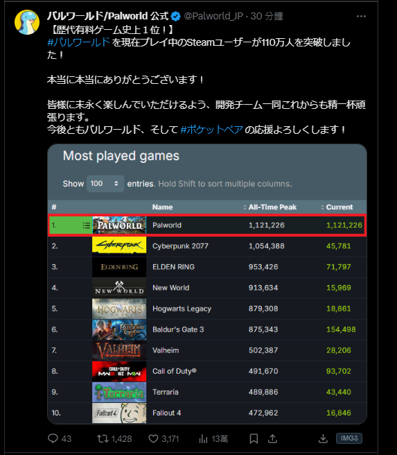 推 oscarss07: 剛剛官方X已經宣布 帕魯是付費遊戲最高歷史同上了 01/21 20:55