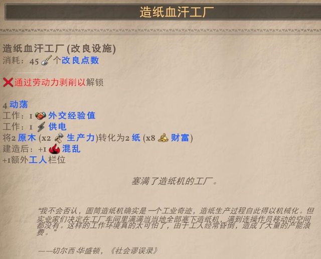 捨棄了帶來食物的效果 但卻能夠沒有工人卻能生產棉花2的能力,有工人則4棉花,但一樣沒有食物生產