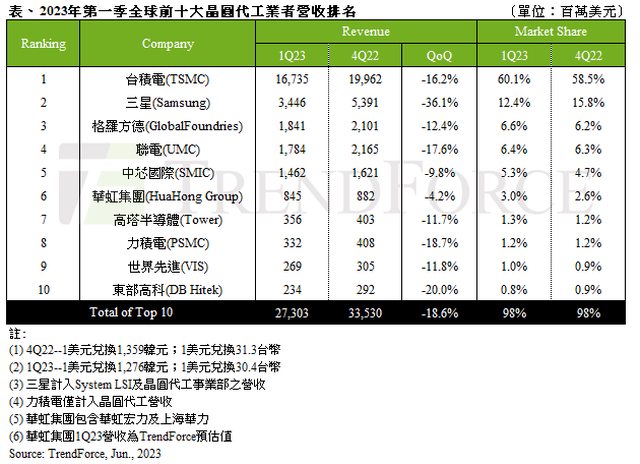 前十大晶圓代工業者營收季跌幅達18.6%,約273億美元。本次排名最大變動為格羅方德(Gl