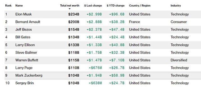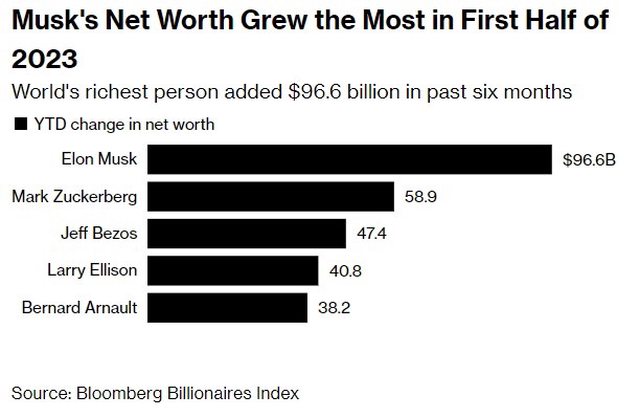 截至7月3日,馬斯克在彭博億萬富豪排行榜排名第一,身價2,340億美元;祖克柏排名第