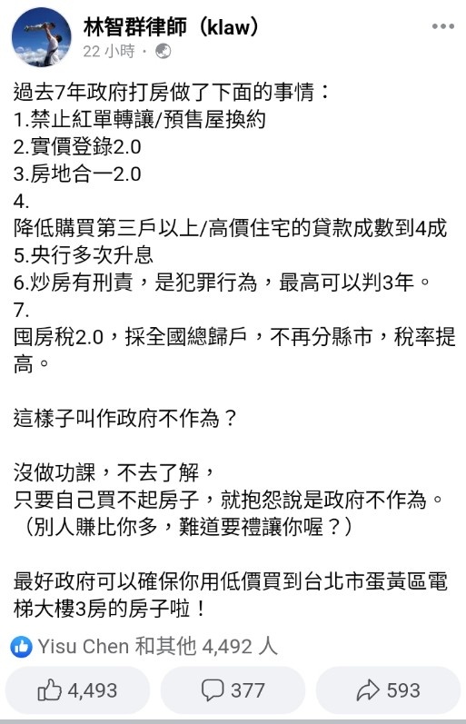 → apple6 : 林智群律師說得好:台灣人自己沒用買不起房,只會 07/07 14:16
