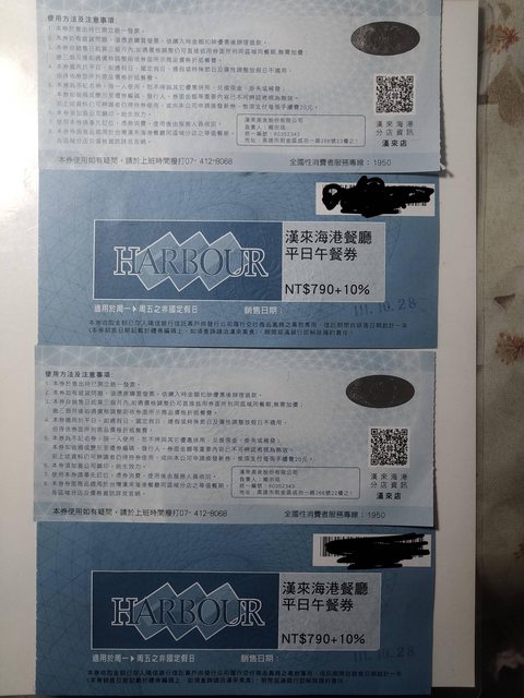 1.漢來海港午餐券×4,票面價790,售2680