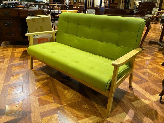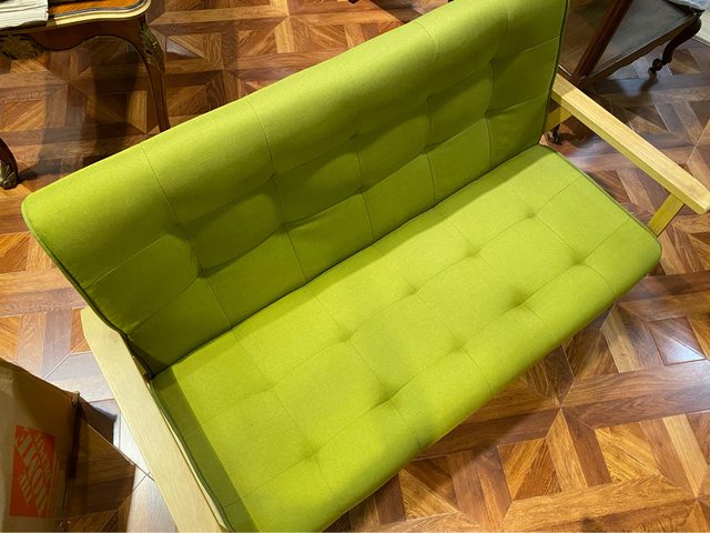 公司樣品屋展示用雙人沙發,因現在用不到了故售出。蘋果綠的材質加上白橡木色的沙發