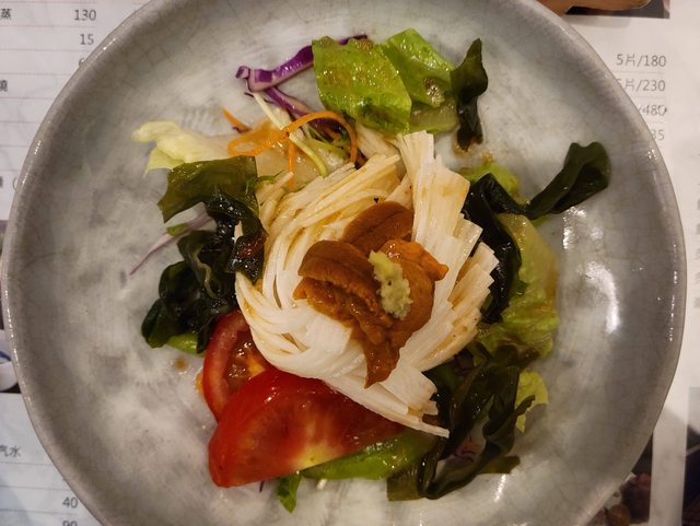 海膽略帶藥水味。山藥軟細稠滑,底部為生菜搭配和風醬