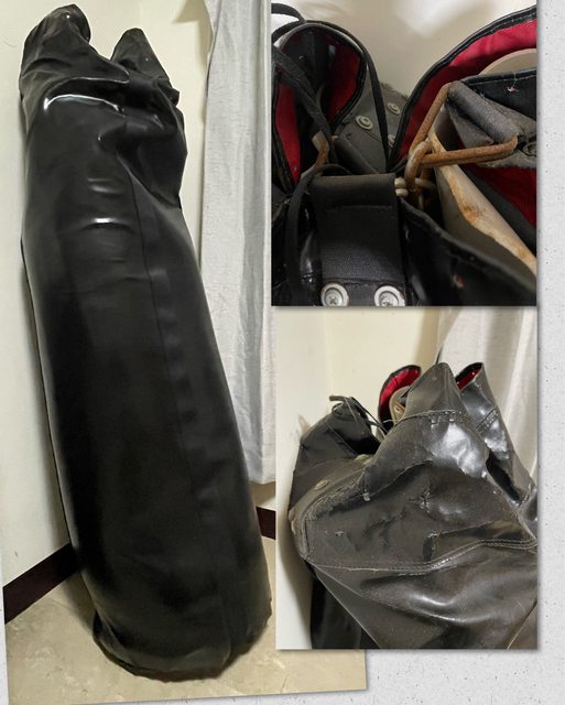 沙包上面的皮革有裂、金屬扣環有生鏽、沙包內已經有塞碎布