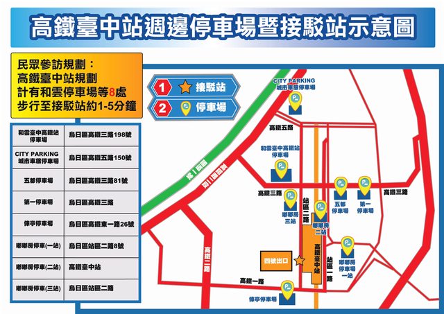 (1)高鐵臺中站停車場:和雲停車場、嘟嘟房停車場及俥亭停車場等,計1,980個汽車停車位