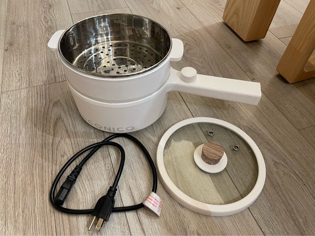有附一個蒸籠層,鍋子是陶瓷不沾塗層