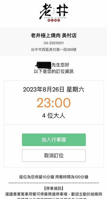 標題[贈送] 8/26老井燒肉深夜時段訂位