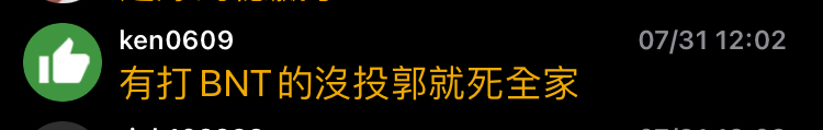 → k70113 : 郭粉威脅你們打BNT沒投郭的死全家唷 XD 08/16 18:00