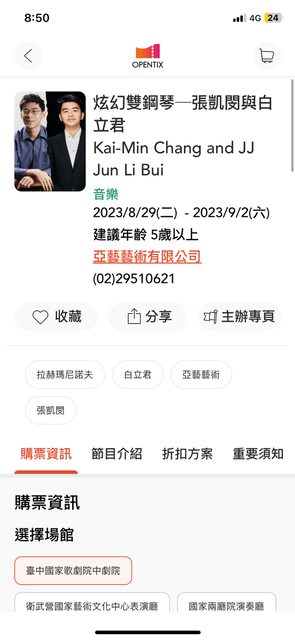 物品名稱:西屯 炫幻雙鋼琴-張凱閔與白立君,歌劇院演奏會門票一張
