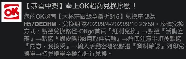 物品名稱:OK大杯莊園級拿鐵折$15序號
