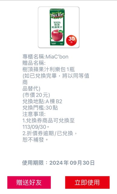 標題[贈送] 中友百貨Mia Cbon蘋果汁電子券