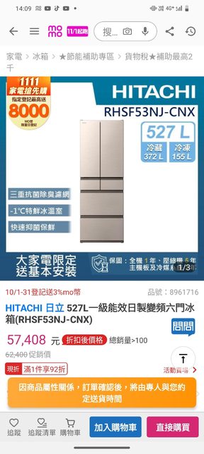 更新 後來選了日立的六門冰箱 燦坤 全國電子。MOMO的價格都一樣 但是燦坤有延長七年保固 全國只有五年 https://i.imgur.com/gu41olH.jpeg