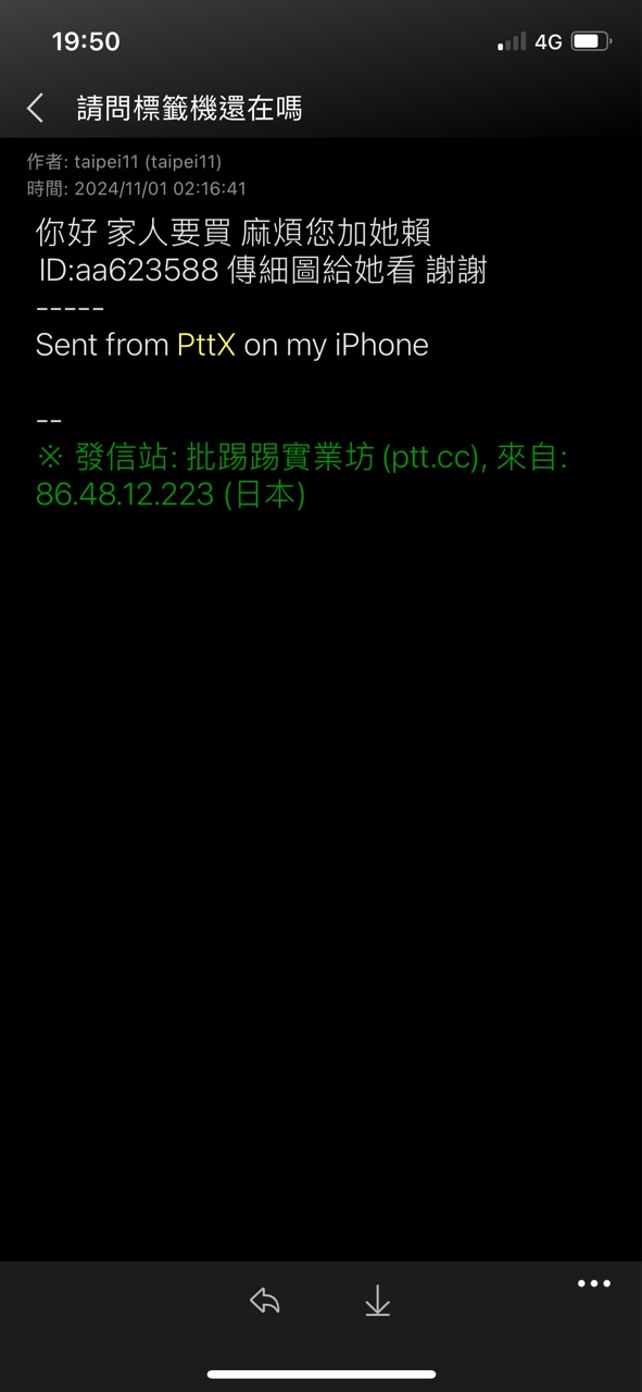 → newgrand: 看來是亂槍打鳥,LINE ID 是多帳號 1.168.11.204 11/01 19:40