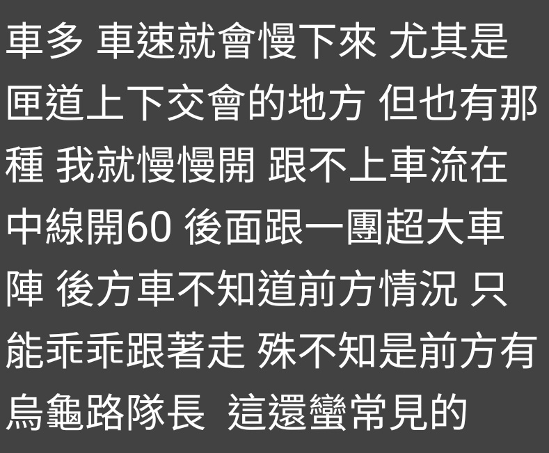 推 chehsien: 結果就是內線一堆低於80 造成塞車 27.51.129.74 11/20 16:55
