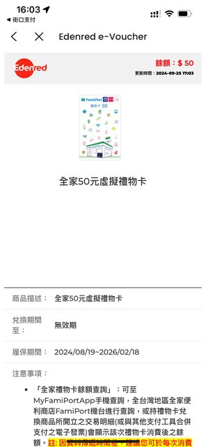 全家50元虛擬禮物卡*1