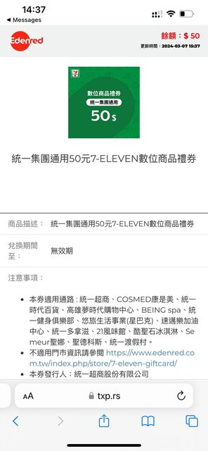 統一集團通用100元7-ELEVEN數位商品禮券*1