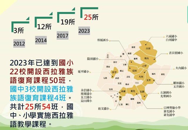 南市原住民事務委員會表示,西拉雅語正式進入教育體系,2013年迄今,共有25所54班國