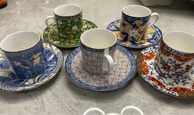 4.Hola購入杯盤組五入/150/每個杯盤花色皆不同,適合喝咖啡或花茶,無盒