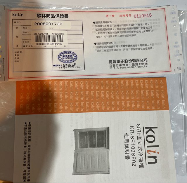 這台冷凍櫃當初於110/6/18購入,壓縮機保固三年也還在保固內,附保卡、說明書,因為