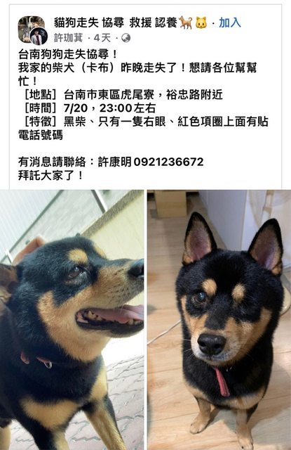 已獲得飼主同意協助轉發。 因為明天颱風就要來了,是一隻年長且有眼疾的柴柴,至今仍未找到令人很擔心QQ,若版 友 有消息,再麻煩電聯照片啟事文中的許先生,謝謝! 聯絡資訊:0921-236672 (或0929-323750) 許先生 https://i.imgur.com/lxMsgzH.jpg