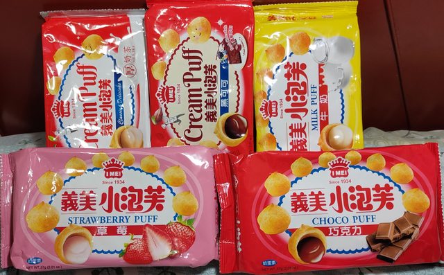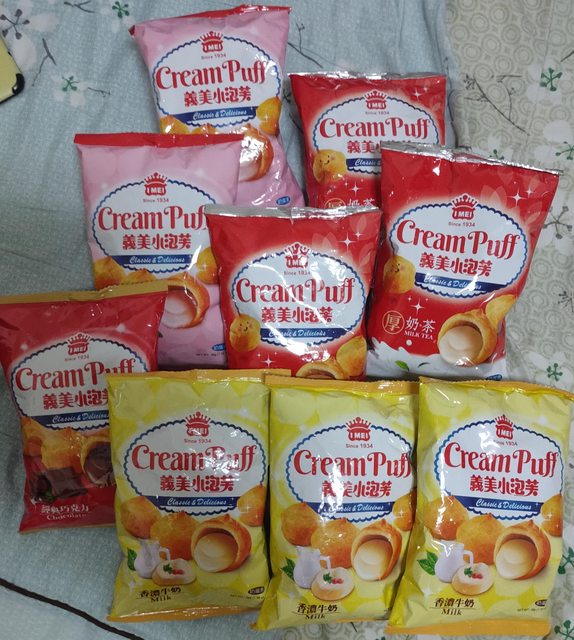 7.義美小泡芙39克有36包(草莓13 牛奶9 巧克力11 厚奶茶3),9包售150元,