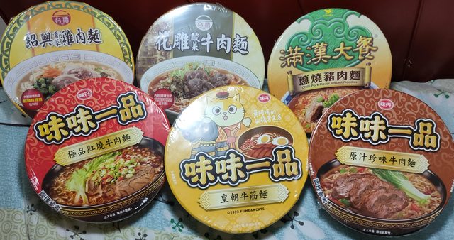 9.滿漢大餐&味味一品&台酒泡麵有21碗(皇朝牛筋1 極品紅燒牛肉3 珍味牛肉3 珍味 爌肉2 蔥燒牛肉2 蔥燒豬肉2 花雕酸菜牛肉3 紹興雪菜雞肉5),一碗45元,有效期 限2023/11/30