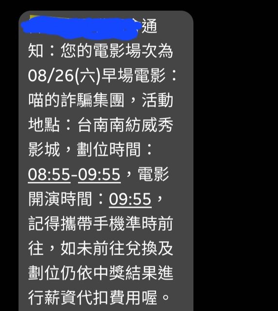 我抽到2張明天早場的電影「喵的詐騙集團」時間是09:55