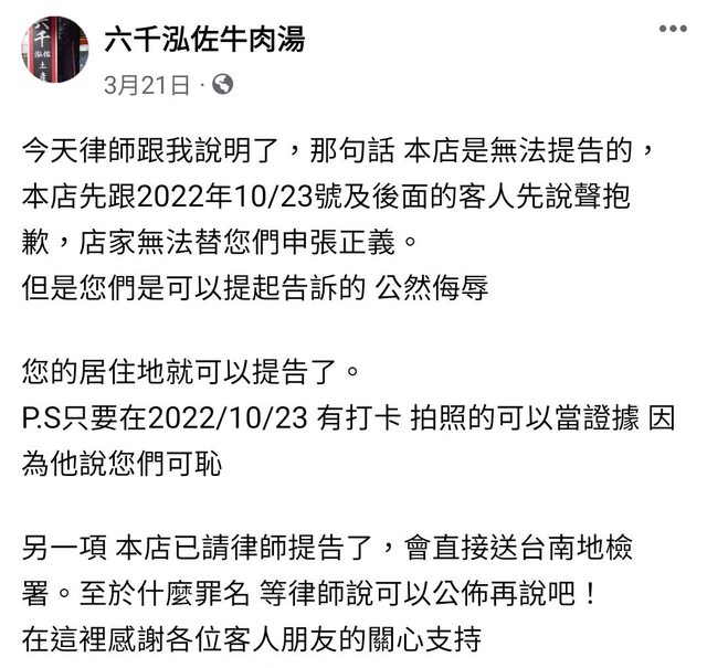 : 那個小編家境不太好,他昨天也回高雄了,我們店家也不追究了,大家這件事就告一段落 : ,該罵的我們都罵了,我們也承受各位的建言,好的壞的我們都接受,請停止言語上衝突 : 也給年輕人一個機會,每個人都會犯過錯誤,我們店家都選擇原諒,事情到這邊爲止就好 : 。 傻眼 所以六千牛肉湯整間店已經盤讓 換人經營了嗎? 小編的父母是六千牛肉湯開業的老闆 https://i.imgur.com/Xz9j8bb.jpg