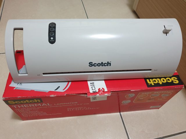 <洽中>2.3M SCOTCH A4 護貝機 TL902 贈護貝膜42張 300元 ■2021/5/11於九乘九購入,用2~3個月左右就收起來了,外觀完整。 ■可能因護貝溫度偏高,護貝後有輕微波紋,在光線下反光才看的到,不仔細看不太明顯 ,如圖、影片。因幾百元的小電器送修不划算,故便宜賣,適合護貝消耗性用品,如菜單 、場地 佈置、教室佈置、學習字卡、名牌... ■贈沒用完的護貝膜42張,價值約70元。 ■盒外邊緣有退色,不影響功能。 ■製造日期:2019/04/12