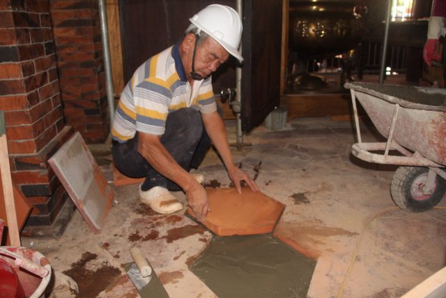 李昆山匠師進行六角磚地坪仿作。(張家綾攝影,南市文化局提供)