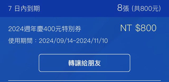 交易物品/金額/說明:如圖片,高雄夢時代電子禮券價值$800元,$600出售