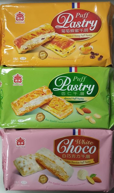 4.義美千層派,葡萄蜂蜜14包,白巧克力15包,杏仁24包,一包35元,3包100元,11包35