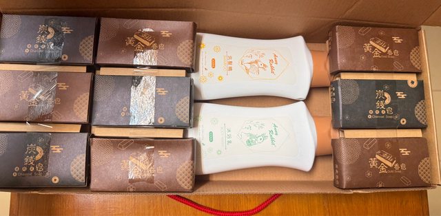 炭錢皂生活用品禮盒,沐浴乳一瓶、洗髮精一瓶、炭錢皂九塊,售550元