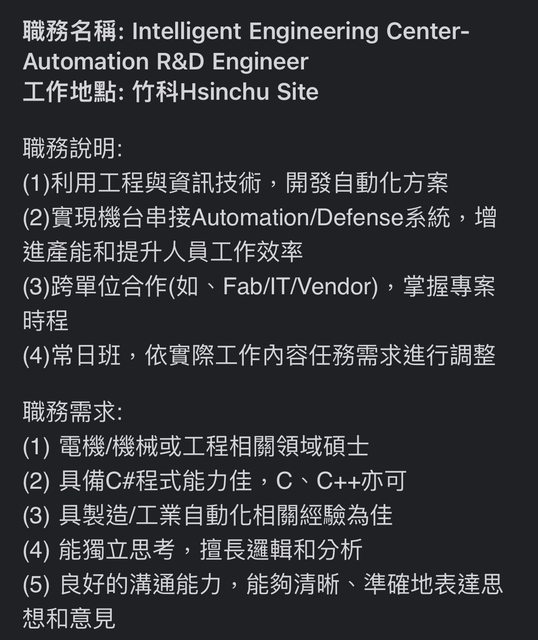 推 ccccccrex : 這職缺和設備同等階級,被製造部追著打 10/12 14:23