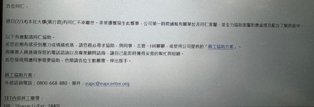 timeaftime : 離職就好了 公司沒那麼偉大 自殺不值得 07/23 08:12