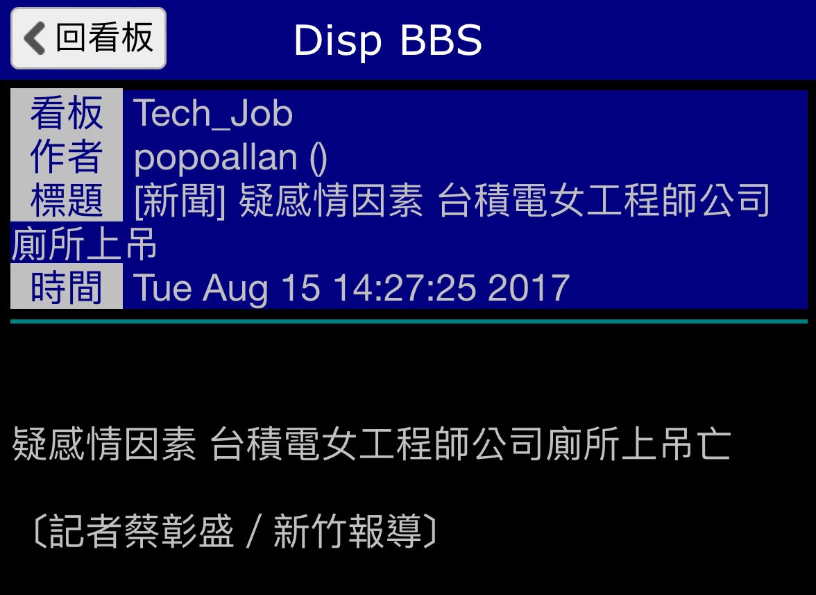 leoz69927 : 而且GG好幾個在公司廁所上吊的後來都被歸咎各種原因 07/25 07:46