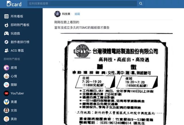 一名網友在Dcard發文,貼出台積電1990年招募「助理技術員」的廣告,徵人條件為女性