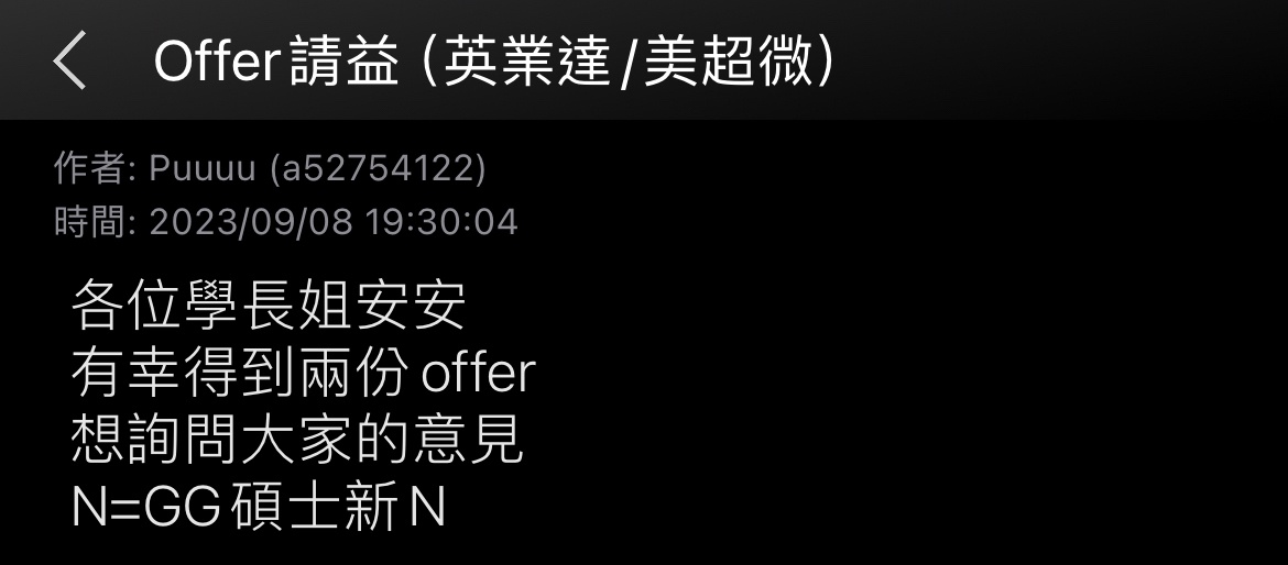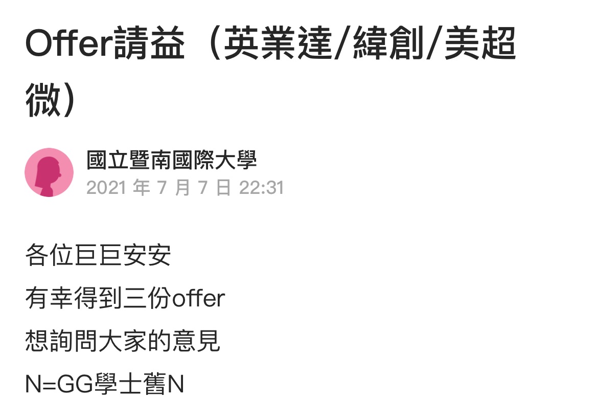 → qmei999 : 在那亂?連這家公司的offer都拿不到在那亂版實在很 11/19 10:55