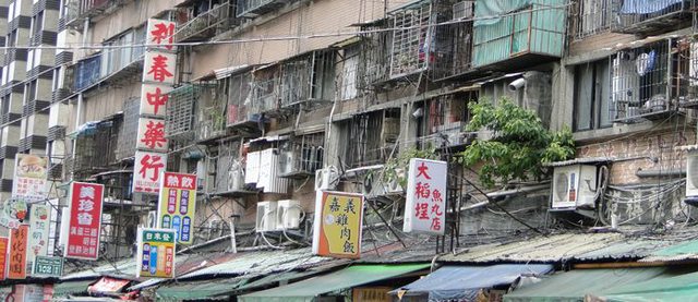 : 台灣老公寓滿滿的鐵皮加蓋、鐵窗、雨遮跟雜亂無章的招牌