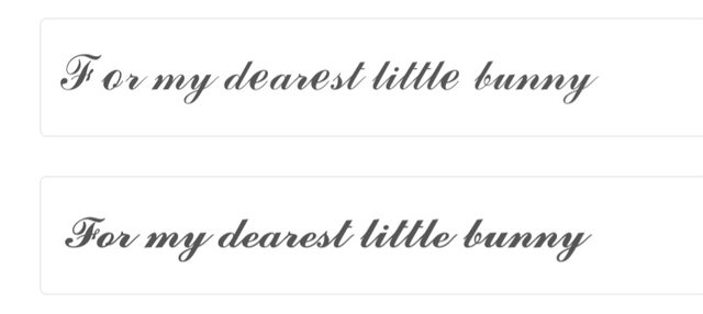 客製化的大部分細節已經決定了,主體、項圈、蝴蝶結、內裏的墊片、筆插票據夾等,最後進展到刻字的環節,會刻在正面翻開後的右下角。 在請教了一些友人之後得到了以下幾句。 像是簡單粗暴的 「To My Love 她的英文名」(給吾愛) 或 「My lifetime love 英文名」(一生摯愛) 「Love 英文名 Always」 其中我最喜歡的是 「For my dearest little bunny」(獻給我最親愛的小兔子) 女友性格較為低調內斂,在推敲語感跟喜好 (我跟她都非常喜歡兔子) 後,決定用這一句。 問題來了,對於用字的大小寫美感,我陷入了選擇困難。 是「For my dearest little bunny」好? (只有首句首字母大寫) 還是「For My Dearest Little Bunny」好呢? (每個字的首字母皆大寫) 預計用的字體是英文花體。 大概看起來會是這樣。 http://i.imgur.com/1D1TzG8.jpg