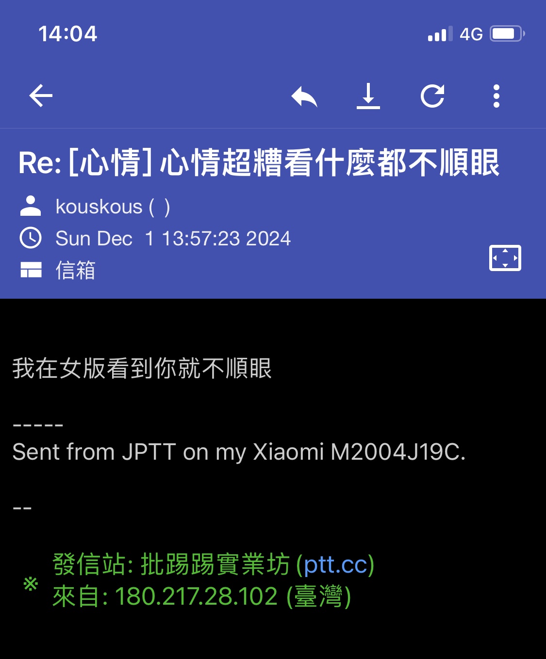 → robby1kimo : 心情很糟就不該想東想西的 49.216.47.17 12/01 12:05