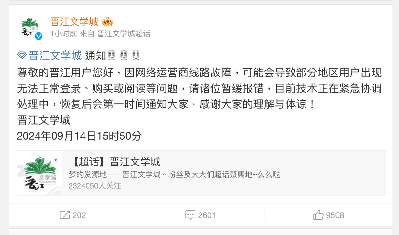 推 jas0111: 是晉江的問題,他們在微博發了公告。 09/14 18:09
