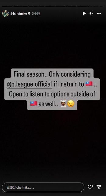 艾夫伯退休的最後一個賽季 正式表態如果可以續留台灣 只願在P+ 來源: https://reurl.cc/WG5Onk 艾夫伯ig限動 看來是跟雲豹沒談成了 P哪一隊欠砍分小洋的 要不要出手了?? -- ※ 發信站: 批踢踢實業坊(www.ptt-web.org.tw), 來自: 111.251.71.148 (臺灣) ※ 文章網址: https://www.ptt-web.org.tw/basketballTW/M.1692748664.A.99C